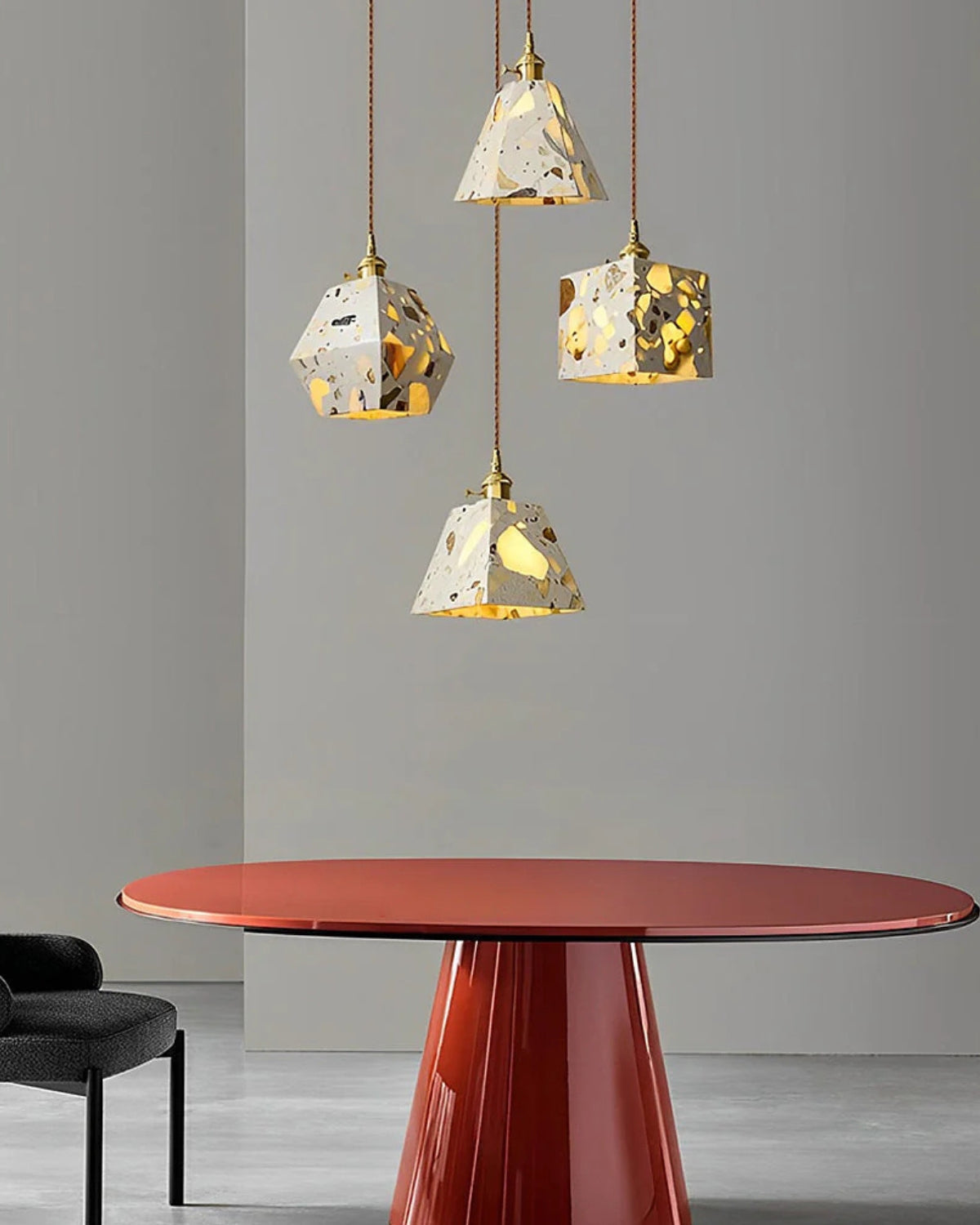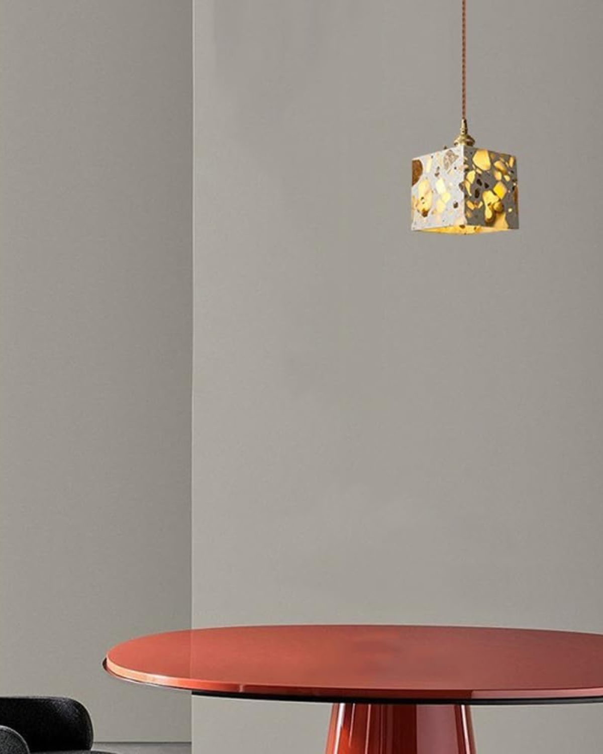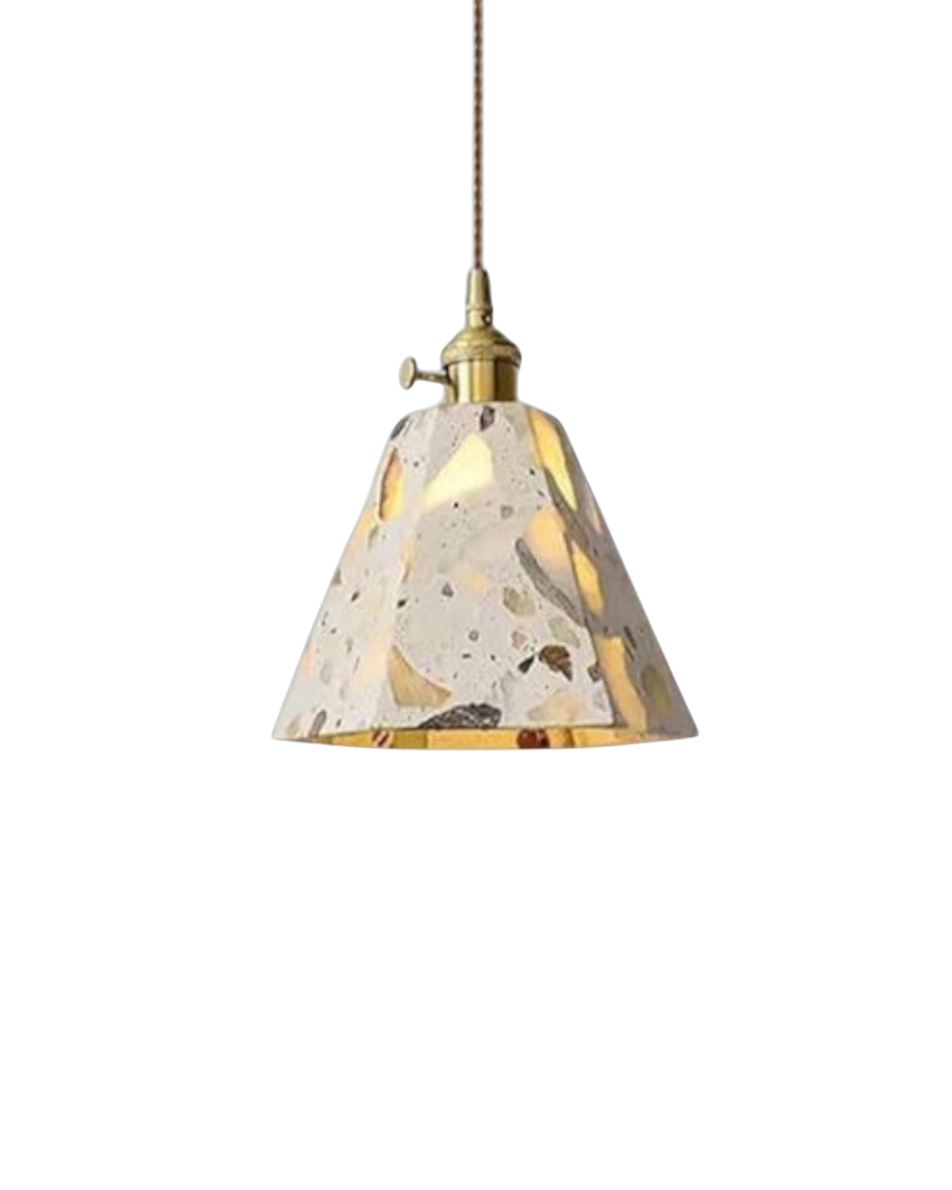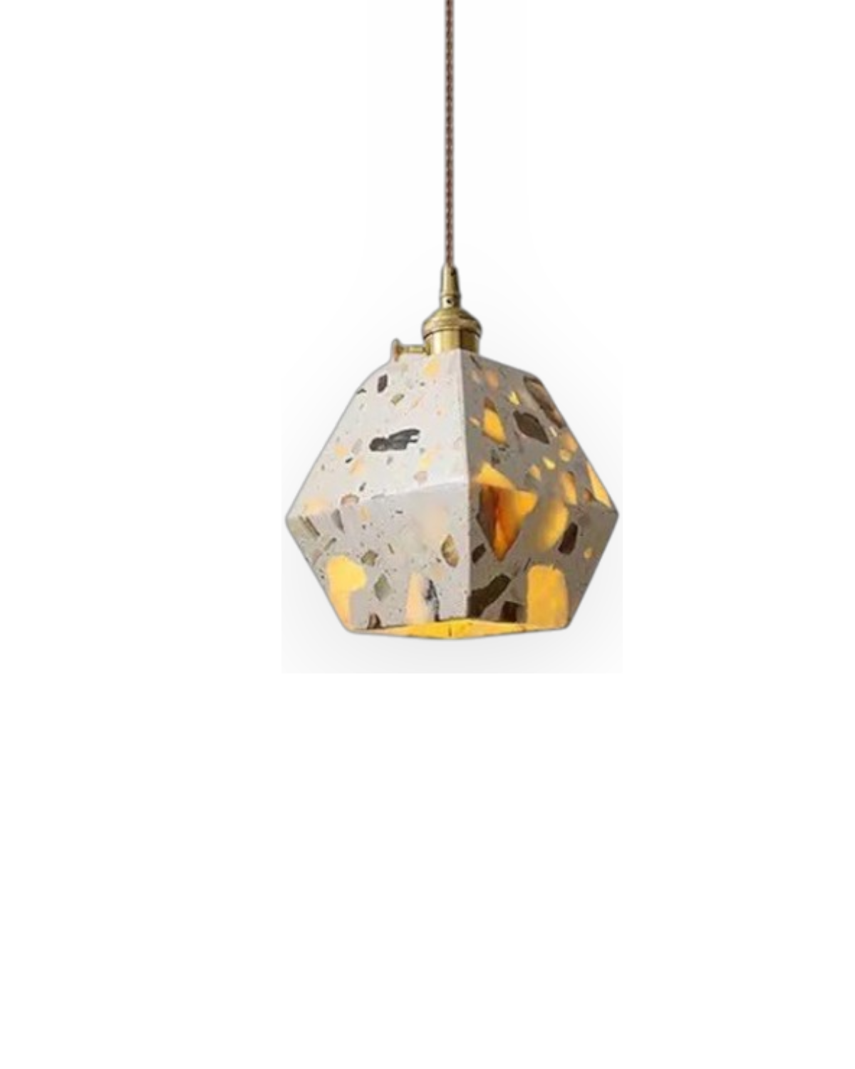 Sapientemente realizzato in pietra terrazzo di alta qualità, cemento e rame spazzolato, ogni pezzo presenta un mosaico unico di frammenti naturali, che conferisce carattere, texture e fascino visivo a qualsiasi ambiente. Che sia sospeso sopra un tavolo da pranzo, un comodino o un accogliente angolo lettura, la sua luce soffusa e la sua silhouette audace creano un punto focale di grande impatto.
