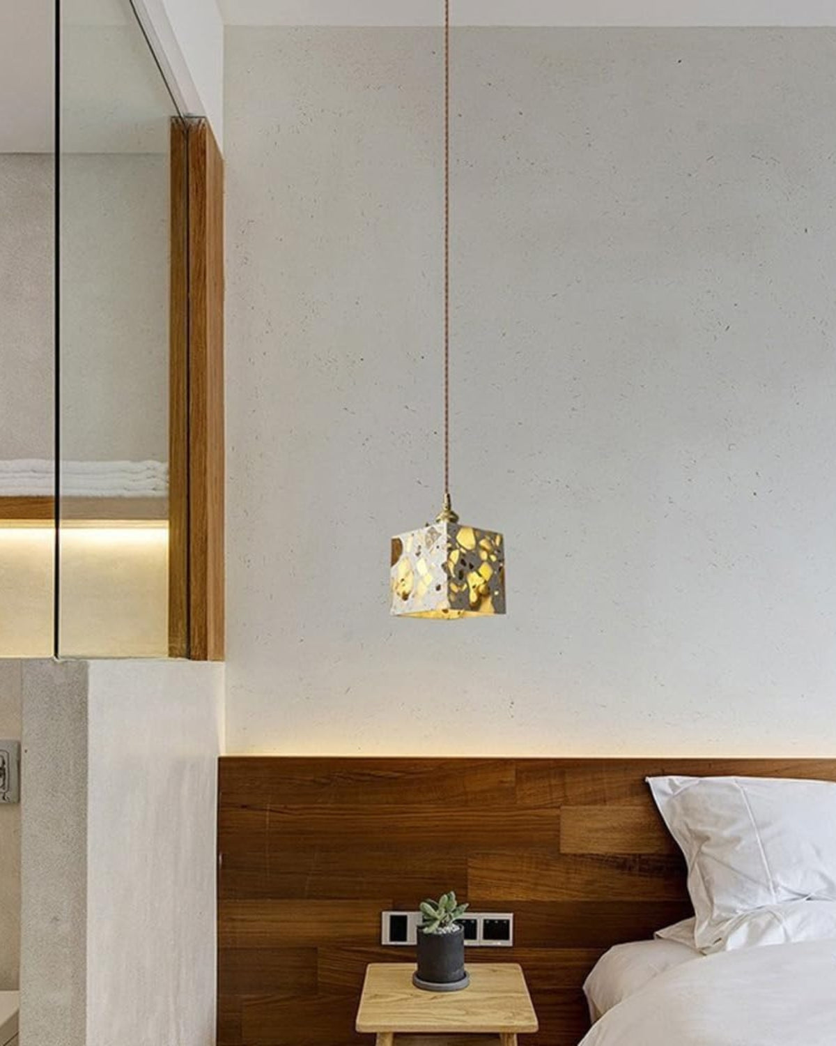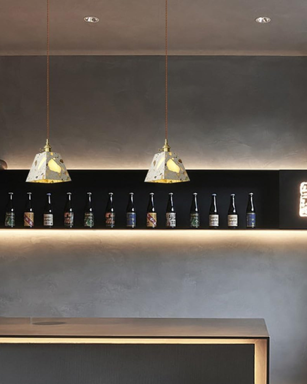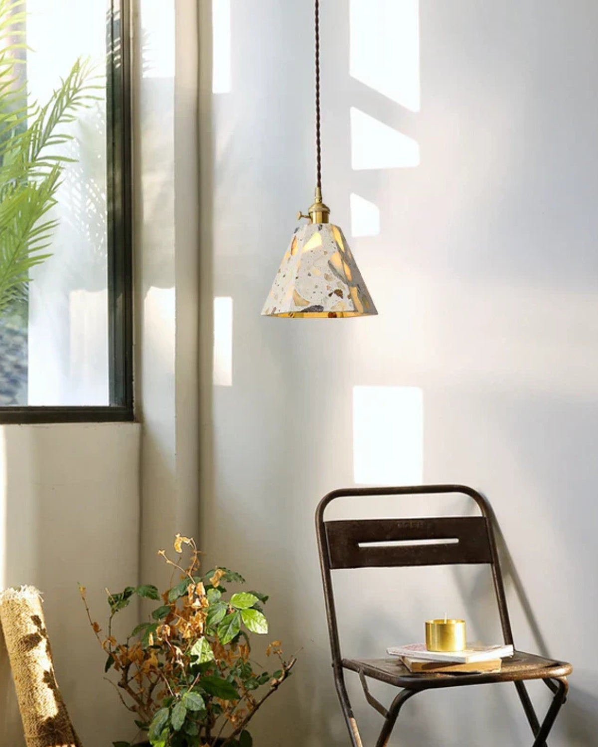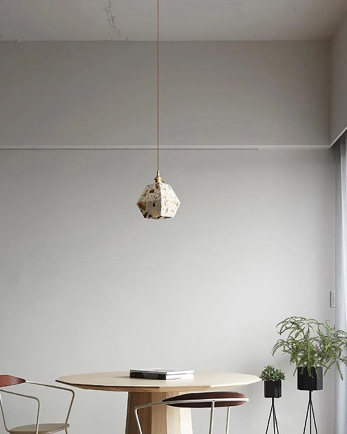 Sapientemente realizzato in pietra terrazzo di alta qualità, cemento e rame spazzolato, ogni pezzo presenta un mosaico unico di frammenti naturali, che conferisce carattere, texture e fascino visivo a qualsiasi ambiente. Che sia sospeso sopra un tavolo da pranzo, un comodino o un accogliente angolo lettura, la sua luce soffusa e la sua silhouette audace creano un punto focale di grande impatto.