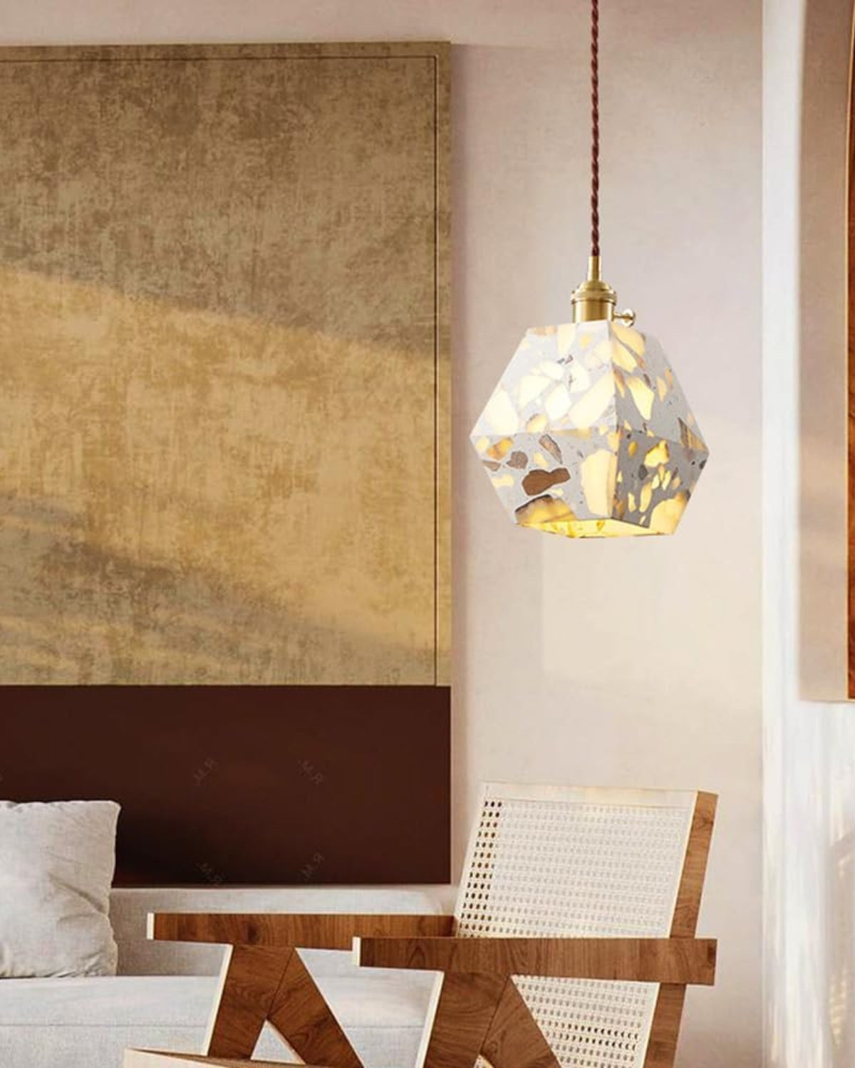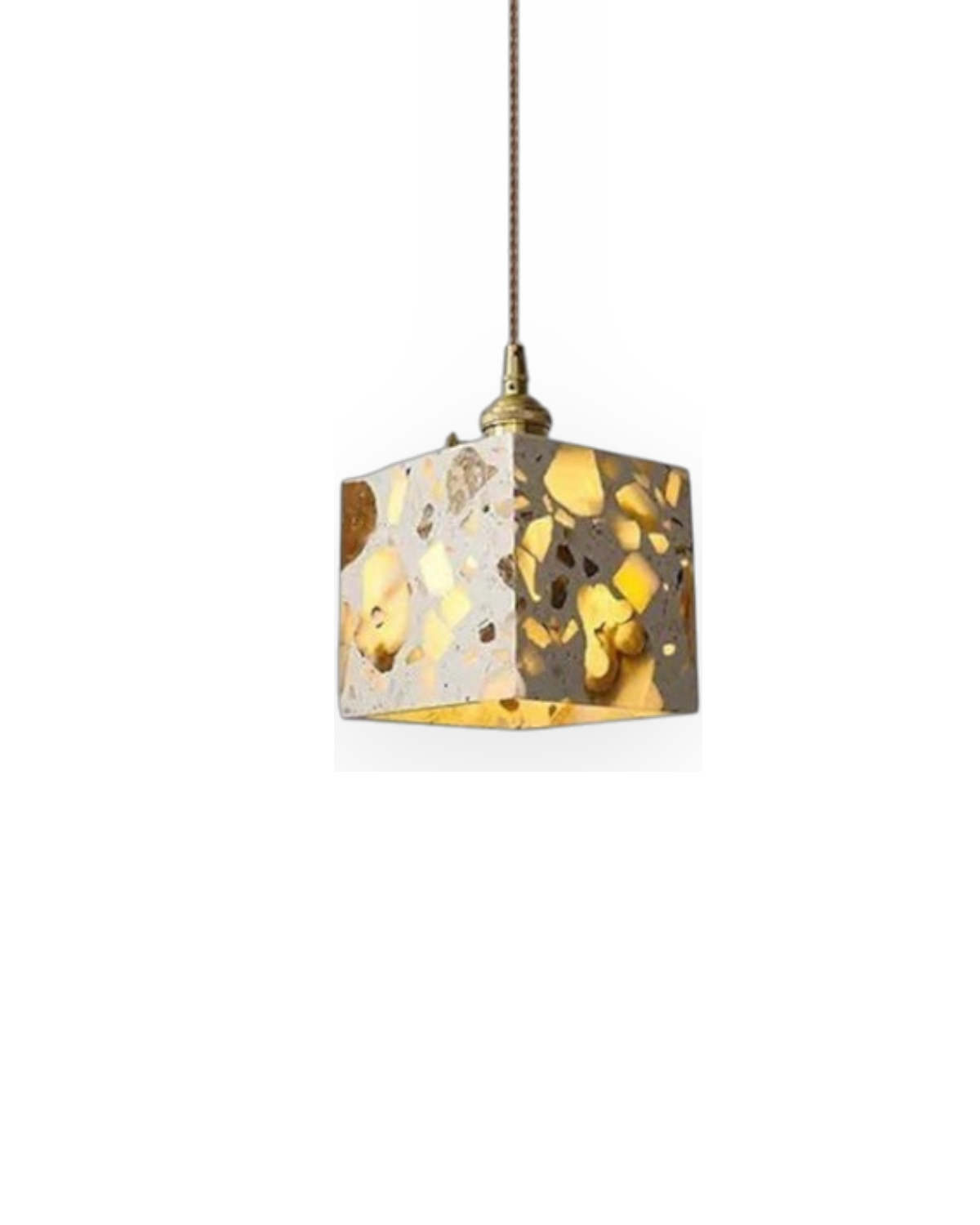 Intrisa di arte contemporanea e fascino senza tempo, Le Marbre Éclatant trasforma il tuo spazio con la sua geometria scultorea e la luminosa finitura effetto terrazzo. Questa splendida lampada a sospensione evoca la raffinatezza del design europeo, abbracciando al contempo il calore dell'eleganza artigianale.