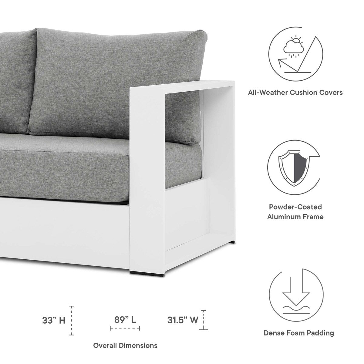 Valorizza il tuo spazio esterno con il set da 2 pezzi in alluminio verniciato a polvere Tahoe Outdoor Patio. Questo set contemporaneo è realizzato in resistente alluminio verniciato a polvere, che offre qualità duratura e uno stile moderno per il tuo spazio lounge all'aperto. Il divano e il tavolino impermeabili sono dotati di seduta e schienale rivestiti in tessuto impermeabile, con imbottitura in schiuma densa per il massimo comfort. I cuscini rimovibili e antimacchia rendono la pulizia un gioco da ragazzi. Dotato di piedini antiscivolo per proteggere il pavimento del tuo terrazzo o patio, questo moderno set da 2 pezzi per patio viene fornito con istruzioni di montaggio facili da seguire. Capacità di carico del divano: 470 kg.